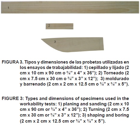 Torneado. De acuerdo con la norma, este ensayo se debe realizar con dos contenidos de humedad: 6 y 12 %. En este caso los contenidos de humedad fueron de 9.7 y 13.3 %, a una velocidad de rotación del cabezal de 3,270 rpm. Con estas variables se obtuvo un tiempo promedio de torneado de 3.87 s. La velocidad de alimentación se calculó con la fórmula indicada para el ensayo de moldurado.