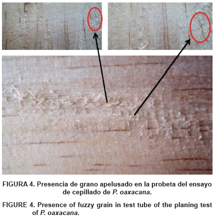 El ensayo de lijado se clasificó como excelente. Sólo el 14 % del total de las probetas presentó el defecto de grano apelusado de manera muy superficial, principalmente por la desviación del hilo, pero no afectó la calidad de manera significativa (Cuadro 4). Este comportamiento se puede atribuir a que la madera de P. oaxacana presenta una textura que va de fina a media; el hilo es recto. Los resultados coinciden con los reportados por Cruz y Borja (1995) para P. cooperi, Martínez y MartínezPinillos (1996) para P. patula, P. pseudostrobus y P. teocote, Borjade la Rosa y Tamarit (1997) para P. arizonica, y con los de Malkoçoğlu y Özdemir (2005) para P. sylvestris. Sin embargo, difiere de lo reportado por Zavala (1976) quien menciona que en maderas blandas, los rayones ocasionados por la lija se acentúan.
