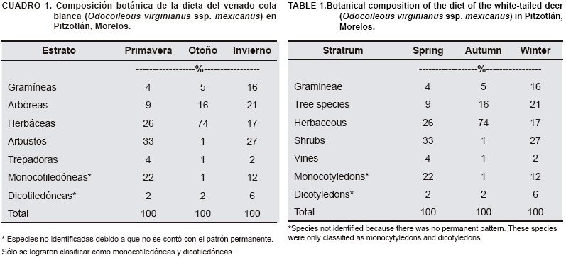 Previo a este trabajo, las dietas (Cuadro 1) del venado cola blanca (Odocoileous virginianus ssp. mexicanus) en la región fueron identificadas a través de la técnica microhistológica de las heces (Vásquez, 2009). En el estudio se reportó que 53 especies vegetales conformaron la dieta. Dichas especies fueron clasificadas en 22 familias botánicas, de las cuales, las más frecuentes en otoño fueron; Malvaceae, Commelinaceae y Myrtaceae, en invierno; Fabaceae, Poaceae, Rubiaceae, Malpighiaceae y Begoniaceae, y en primavera; Rubiaceae, Begoniaceae y Anacardiaceae. Cinco especies (Begonia sp., Malpighia mexicana, Sida sp., Randia aculeta, Bouteloua repens) fueron consideradas de mayor relevancia al formar parte de más del 50 % de las dietas.