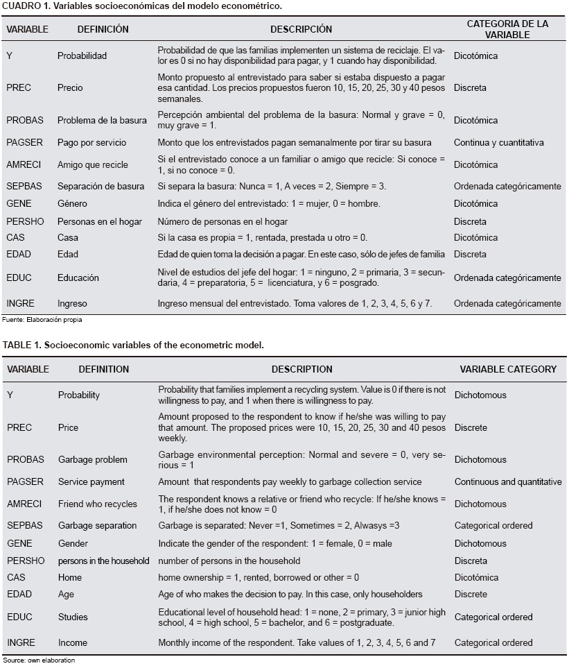 Con base en los resultados del modelo econométrico, las variables más significativas del modelo fueron: el precio, el ingreso, el pago que se realiza por algún servicio de recolección, la separación de basura y la edad. La cuota establecida para implementar un sistema de reciclaje debe estar al alcance de los jefes de hogar, ya que si es muy elevada no se tendrán los resultados esperados. De acuerdo con la variable "pago que se realiza por algún servicio de recolección", los hogares o familias que no cuentan con el servicio de limpia pública o aquellos en los que el servicio es deficiente, son los que están dispuestos a que se implemente el sistema de reciclaje. Así también, las familias que separan la basura respondieron afirmativamente a la propuesta. La variable edad tiene una relación inversa entre el valor de la tarifa a pagar por la implementación de un sistema de reciclaje y la probabilidad de responder afirmativamente a la pregunta de pago. Es necesario implementar programas de educación ambiental en las escuelas desde el preescolar hasta el nivel licenciatura, para concientizar a la población en temas ambientales de gran relevancia como lo es el reciclaje.