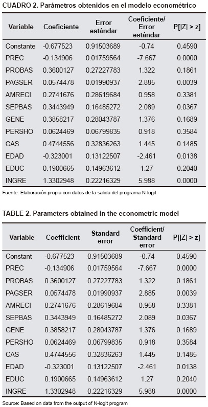 Ajuste. En esta prueba se utilizó la Pseudo-R2 de McFadden, la cual considera valores entre 0.20 y 0.40 como muy satisfactorios. En este estudio el valor fue 0.34 (Cuadro 3).