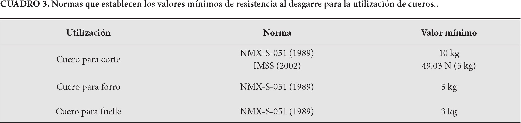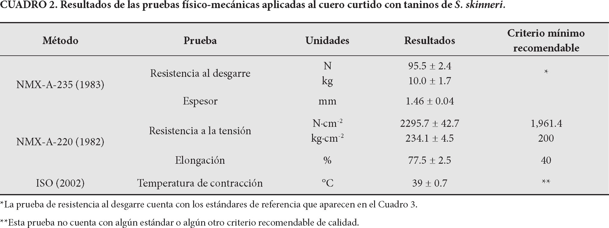 En el Cuadro 2 se reportan los resultados obtenidos al realizar los ensayos en el cuero curtido con la corteza de S. skinneri (calidad mayor que E. compactum). Se puede apreciar que el valor de la resistencia al desgarre supera aproximadamente el doble del valor mínimo requerido (sCuadro 3) para un cuero de corte y el triple en el caso de cuero para forro y fuelle. Asimismo, el valor de la resistencia a la tensión supera, en alrededor de 17 %, el valor mínimo requerido e igualmente el resultado de elongación es mayor en casi el doble al mínimo requerido. Los resultados de las características físico-mecánicas sugieren que la piel curtida con la corteza de S. skinneri pudiera ser utilizada en cueros para corte, forro y fuelle.