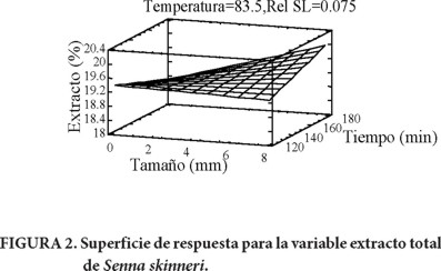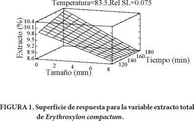 Con base en el análisis estadístico se concluye que las condiciones óptimas de operación fueron: tiempo de 180 min, temperatura de 83.5 °C y una relación sólido-líquido de 1:13, a excepción del tamaño de partícula, pues para E. compactum fue la malla 35 (0.417 mm) y para S. skinneri la malla 3 (6.68 mm). Con dichas condiciones se maximiza la cantidad de extracto total de la corteza, tanto de E. compactum (11.1 %, Figura 1) como de S. skinneri (20.9 %, Figura 2). Estos valores son mayores a los reportados para cortezas de diferentes especies de pino (2.23-10.61 %) (Rosales-Castro & González-Laredo, 2003) y se ubican dentro de los valores reportados para algunas maderas latifoliadas (14.2-33.4 %) (Paes, Diniz, Marinho, & Lima, 2006).