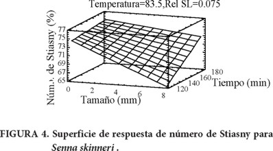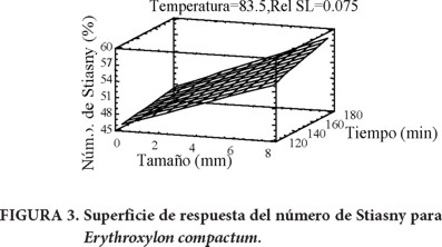 Con relación al número de Stiasny (taninos condensables), el valor óptimo (60.1 %) para la corteza de E. compactum se obtuvo cuando las condiciones fueron: tamaño de partícula de 6.68 mm, 180 min de extracción a 83.5 °C con relación sólido-líquido de 1:13 (Figura 3). El valor óptimo (79.4 %) para la corteza de S. skinneri se obtuvo con las mismas condiciones a excepción del tamaño de partícula, 0.417 mm (Figura 4). El resultado también fue mayor en S. skinneri, como en el caso del contenido de extracto. Los valores del número de Stiasny se encuentran dentro del rango que se obtuvo en un estudio con diferentes cortezas de pinos (30-80 %) (Rosales-Castro & González-Laredo, 2003) y con diferentes cortezas de latifoliadas (52.9-73.5 %) (Paes et al., 2006). En ambos casos, la extracción se hizo también en medio acuoso.