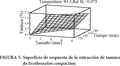 Las condiciones óptimas para maximizar la extracción de taninos fueron las mismas para ambos tipos de corteza: 180 min de extracción, a 83.5 °C con tamaño de partícula de 6.68 mm y una relación sólido-líquido de 1:13. El valor óptimo para E. compactum fue 5.6 % y para S. skinneri 15.8 %, diferencia claramente observable en la Figura 5 y Figura 6, respectivamente. El resultado de E. compactum es cercano al encontrado en la corteza de Pinus leiophylla (5.88 %) y ligeramente menor al reportado para la corteza de P. duranguensis (6.44 %) (Rosales-Castro & González-Laredo, 2003), mientras que el contenido de taninos para S. skinneri está dentro de los valores encontrados en Anadenanthera culubrina (11.9 %) y en Anacardium occidentale (19.8 %) (Paes et al., 2006). El resultado de la prueba para determinar taninos hidrolizables en las muestras de corteza fue negativo; este tipo de taninos ocurre sólo en algunas especies dicotiledóneas (Scalbert, Monties, & Janin, 1989), mientras que los taninos condensables son más frecuentes (Hillis, 1987) y son los extractos curtientes más importantes (Romahn de la Vega, 1992).