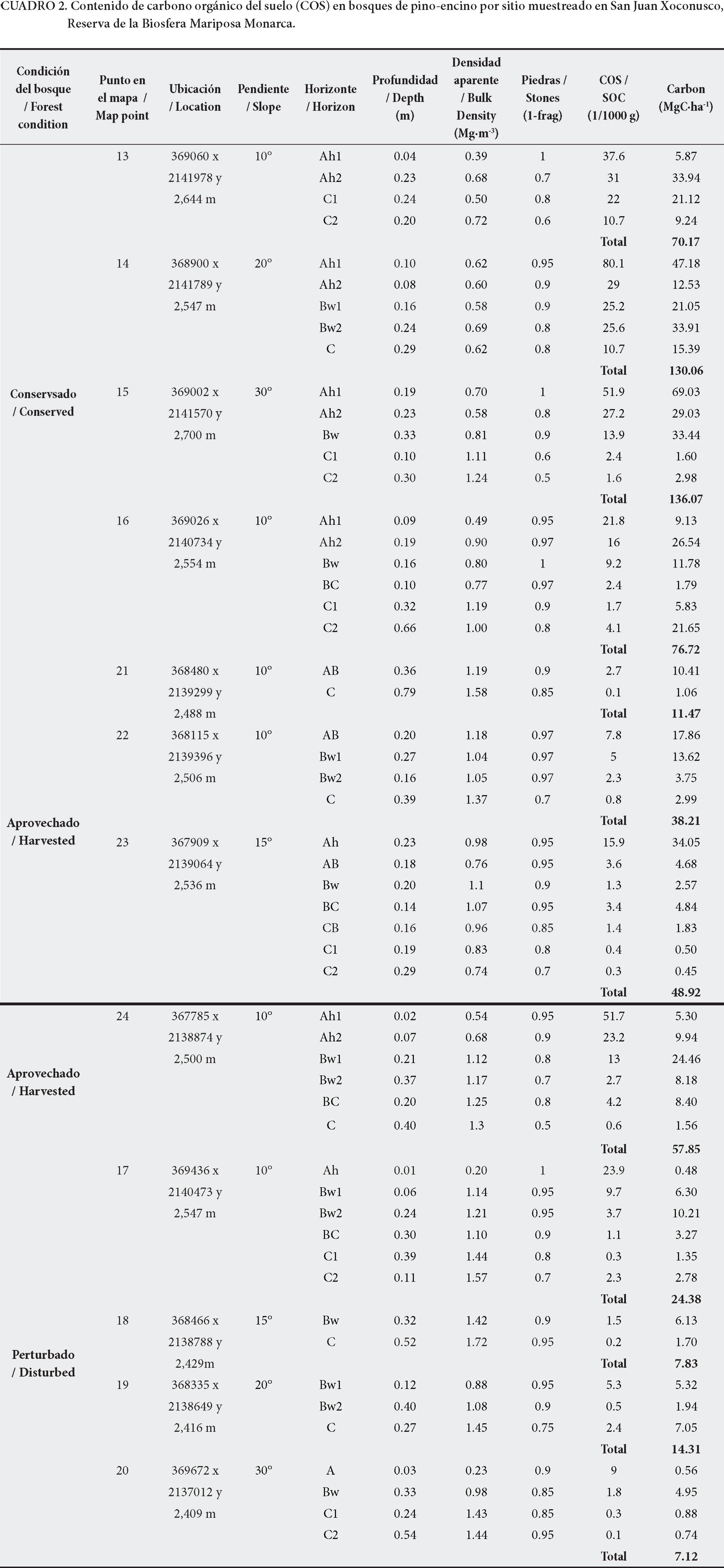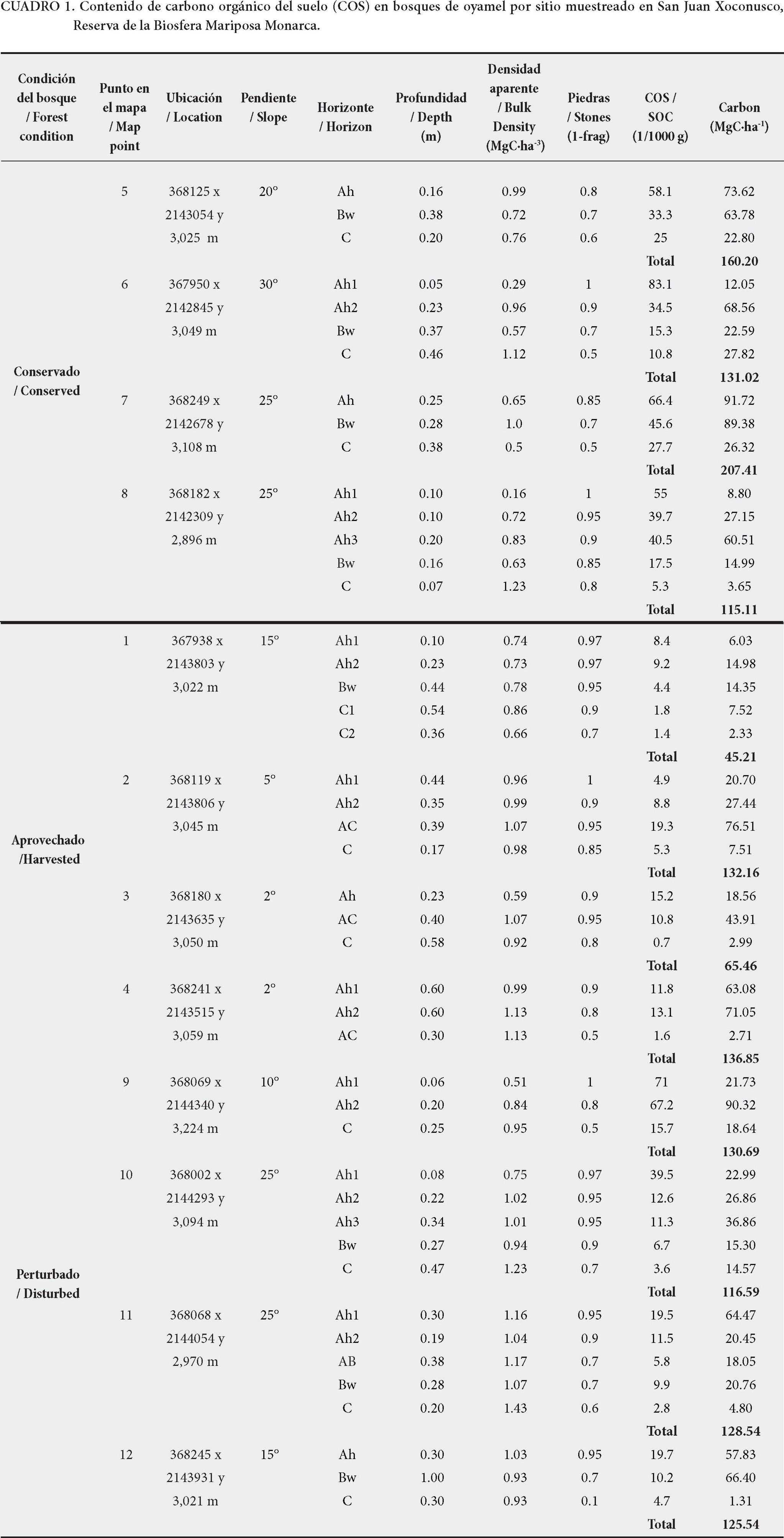 A nivel mundial, el suelo almacena dos veces más carbono que la atmósfera y casi el doble de la cantidad almacenada en la vegetación. La capacidad de almacenamiento de carbono de los suelos depende de sus propiedades y usos. El objetivo del presente trabajo fue analizar el contenido de carbono orgánico del suelo (COS), bajo diferentes condiciones forestales dentro de la Reserva de la Biósfera Mariposa Monarca en México. Para ello se definieron seis grupos de muestreo, basándose en tres condiciones del arbolado (conservado, aprovechado y perturbado) y dos tipos de vegetación (oyamel y pino-encino). Para cada grupo se calculó el contenido de carbono en cuatro perfiles de suelo completos (N=24), comenzando en el horizonte A. Los resultados muestran diferencias en el contenido de COS en suelos que se encuentran bajo diferentes tipos de vegetación y condiciones del arbolado. Los rodales de oyamel conservado tienen en promedio 153 MgC·ha-1 de COS, mientras que los aprovechados y perturbados tienen 95 y 125 MgC·ha-1, respectivamente. Los resultados muestran que el promedio de COS en bosques conservados de pino-encino es de 103 MgC·ha-1, mientras que los aprovechados y perturbados tienen 39 y 13 MgC·ha-1, respectivamente. Los bosques conservados almacenan entre 40-80 % del COS en los horizontes A del suelo. El contenido de COS debería ser considerado para determinar el impacto del manejo forestal o de cualquier otra política de conservación.