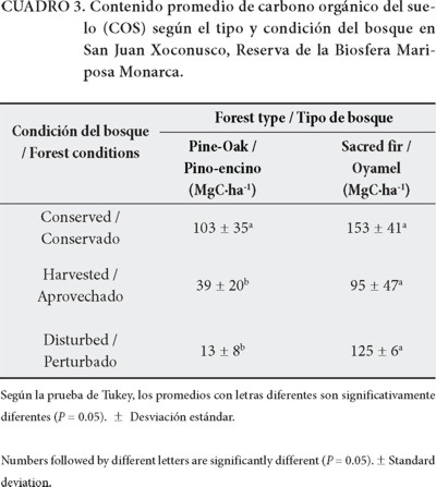 Los resultados muestran que los bosques conservados de oyamel contienen 33 % más COS que los bosques conservados de pino-encino. Esto se puede explicar por las tasas de descomposición de la materia orgánica, las cuales dependen de la temperatura y humedad y varían en relación con la altitud y las especies de árboles que dominan sobre los diferentes grupos de suelos (Avilés-Hernández et al, 2009; Luis-Mejía et al., 2007). La composición química de la madera es un factor importante en el tiempo de residencia de C en el suelo. La lignina es un componente recalcitrante de la madera que estabiliza el COS durante décadas. Los bosques de oyamel tienen un contenido ligeramente más alto de lignina (26.5 %) que los bosques de pino (25.6 %) (Avendaño-Hernández, Acosta-Mireles, Carrillo-Anzures & Etchevers-Barra, 2009; Leifeld & Kögel-Knabner, 2005; Robert, 2001).