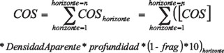 [COS] = concentración de carbono orgánico del suelo obtenido de los análisis de laboratorio (%)