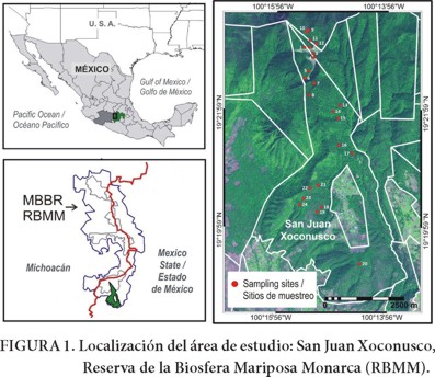 La comunidad indígena de San Juan Xoconusco (SJX) fue seleccionada como el sitio de estudio, ya que ahí existen los dos tipos de bosque representativos de la Reserva y se llevan a cabo diversos usos forestales. SJX tiene una extensión de 1,660 hectáreas y se encuentra en el municipio Donato Guerra, en el Estado de México. La comunidad se encuentra al sur de la RBMM entre las coordenadas 19° 18' 36'' - 19° 23' 29'' N y 100° 13' 22'' - 100° 16' 16'' O (Figura 1).