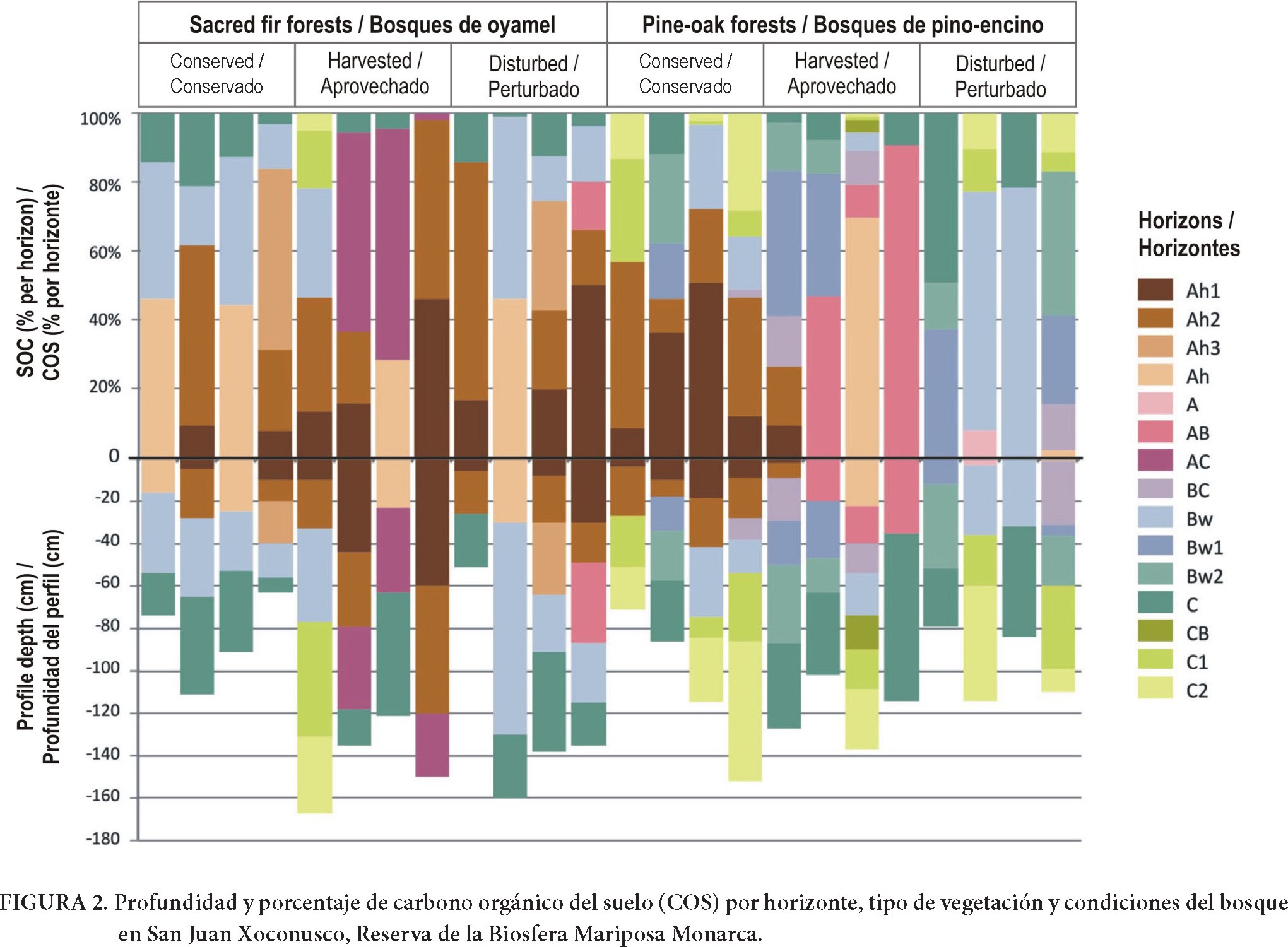 Considerando el COS total almacenado en el perfil completo del suelo, los bosques conservados de oyamel almacenan entre el 45 y el 80 % en los horizontes A (generalmente en los primeros 0-40 cm del suelo). Del 20 a 55 % de COS restante se encuentra en los horizontes B y C (a una profundidad de 20-110 cm). Los bosques de oyamel aprovechados almacenan del 50 al 95 % de COS en el horizonte A, el cual tiene una gran variabilidad de profundidad (entre 30 y 120 cm, en los andosoles de la zona de estudio). En el caso de de los rodales de bosques de oyamel perturbados, los horizontes A contienen 45-85 % del COS, con profundidades que van de 0 a 65 cm (Figura 2).