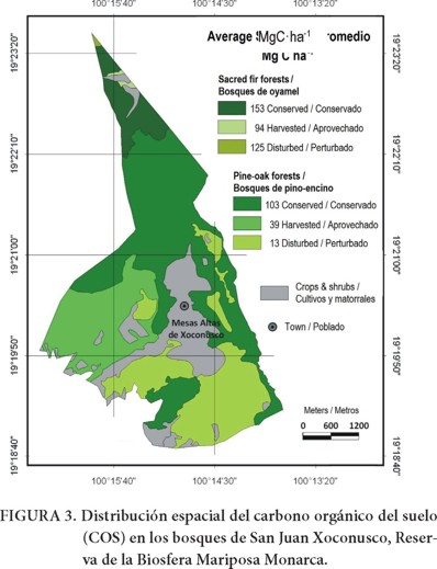 La estimación de la distribución espacial del COS en la comunidad de SJX (24 muestras en 1,660 ha) mostró que existe mayor cantidad de COS en los bosques de pino-encino, simplemente porque estos bosques ocupan un área mayor (Figura 3). Al sur de SJX, la concentración del COS es menor como consecuencia de las perturbaciones relacionadas con la tala ilegal y los incendios provocados. Estos procesos reducen la cubierta forestal y por lo tanto disminuyen el aporte de materia orgánica al suelo (Jandl et al., 2007; Saynes et al., 2012; Vesterdal et al., 1995).