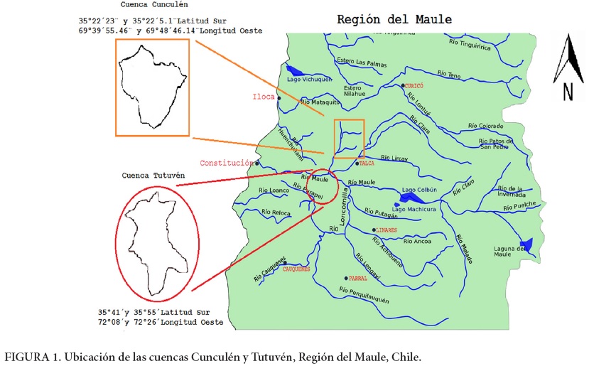 El área de estudio corresponde a dos cuencas de la Región del Maule, Chile, insertas en la zona semiárida o mediterránea con estación lluviosa (entre seis y ocho meses) y otra seca bien definida. La cuenca Cunculén se localiza en la Provincia de Talca, entre los 35° 22' 23"-35° 22' 5.1" S y 59° 39' 55.46''-59° 48' 46.14'' O; con una superficie aproximada de 86.66 km2, mientras que la cuenca Tutuvén se ubica en la provincia de Cauquenes, entre los 35° 41'-35° 55' S y 72° 08'-72° 26' O, cuenta con una superficie de 209.64 km2. La pluviometría anual alcanza 673 mm en Cunculén y 816 mm en Tutuvén. La ubicación de cada cuenca se presenta en la Figura 1.