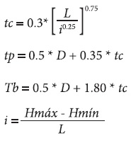 tc = Tiempo de concentración de la cuenca (h) L = Longitud del cauce (km) i = Pendiente del cauce