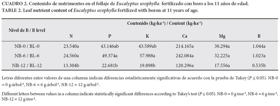 Los resultados mostraron baja respuesta al B después de 11 años. Existen diversas razones que pudieran explicarlo. Los resultados de laboratorio en el componente de hojas + ramillas indican que la concentración de B fue de 62 (±1.5), 68 (±2.0) y 67 (±2.8) ppm cuando se aplicaron 0, 6 y 12 g de B, respectivamente. Estas concentraciones son mayores que las reportadas para el género (Freitas et al., 2009) y entre tres y cinco veces más altas que las encontradas en otras especies forestales fertilizadas con B como T. grandis (Zhou et al., 2012) y Pinus radiata D. Don (Hawkins, Xue, Bown, & Clinton, 2010). Se ha observado que la fertilización con B a brinzales de Betula pendula Roth puede favorecer la concentración de dicho nutrimento en el follaje hasta en 50 % (Ruuhola, Leppanen, Julkunen-Tiitto, Rantala, & Letho, 2011).