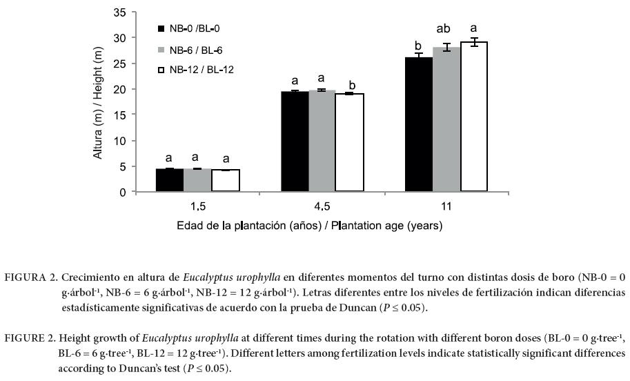 La Figura 1 muestra el comportamiento del diámetro de E. urophylla, a la edad de 1.5, 4.5 y 11 años en los diferentes niveles de B aplicado. Sólo se encontraron diferencias significativas (P ≤ 0.05) a la edad de 11 años.