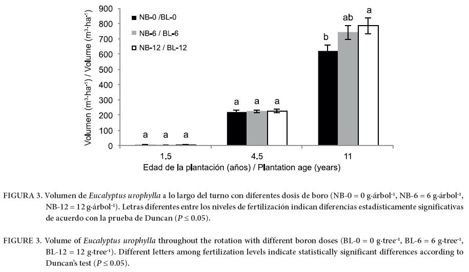 Con relación al volumen, se encontraron diferencias significativas (P ≤ 0.05) entre los niveles de aplicación de B a la edad de 11 años. En la Figura 3 se puede apreciar que con el nivel B-12 se obtuvo mayor volumen (aproximadamente 21 % más que el testigo).