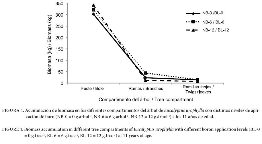 Cuando se aplicó mayor dosis de B, la acumulación de biomasa fue mayor en el fuste y menor en ramas, ramillas y hojas. Esto es de gran importancia para la especie, ya que el fuste se aprovecha para celulosa (Figura 4).