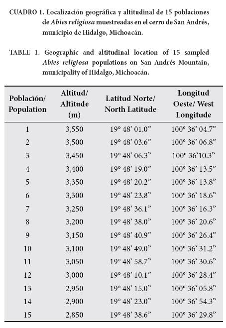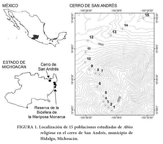 Se ubicaron 15 sitios de recolecta en rodales naturales de A. religiosa a lo largo de un transecto altitudinal (2,850 a 3,550 m de altitud) en los bosques del cerro San Andrés, municipio de Hidalgo, en la región este del estado de Michoacán (Cuadro 1, Figura 1). El transecto incluyó los extremos altitudinales inferior y superior de la distribución de A. religiosa en el área (Cuadro 1). Los sitios se encuentran aproximadamente a 50 m de diferencia altitudinal, en general con exposición norte (Figura 1). El cerro de San Andrés está ubicado en las cercanías de la RBMM (aproximadamente a 58 km) y forma parte del mismo continuo de bosque, por lo que consideramos que los presentes resultados podrían ser aplicados a la RBMM.