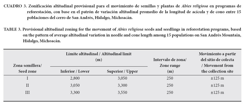 Existe una diferenciación morfológica significativa entre poblaciones de A. religiosa a lo largo del gradiente altitudinal en el cerro de San Andrés, Hidalgo, Michoacán; las poblaciones de baja altitud tienen acículas más cortas y conos más largos que las de elevada altitud. Con base en la variación morfológica, se sugiere una zonificación provisional en tres zonas con intervalo altitudinal de 250 m: zona I, de 2,800 a 3,050 m; zona II, de 3,050 a 3,300 m; y zona III, de 3,300 a 3,550 m. Ignorando el cambio climático, se sugiere reforestar cada zona con planta originada de la semilla de la misma zona o bien originada a ±125 m del sitio que se pretende reforestar. Considerando el desfasamiento adaptativo por el cambio climático, se propone realizar migración asistida a mayores altitudes. Esto se podría hacer recolectando semilla de cada zona altitudinal, produciendo planta en vivero y reforestando sitios ubicados en la zona inmediata superior; es decir, obtener semilla en la zona I, producir planta en vivero y reforestar con ella la zona II, y así sucesivamente.