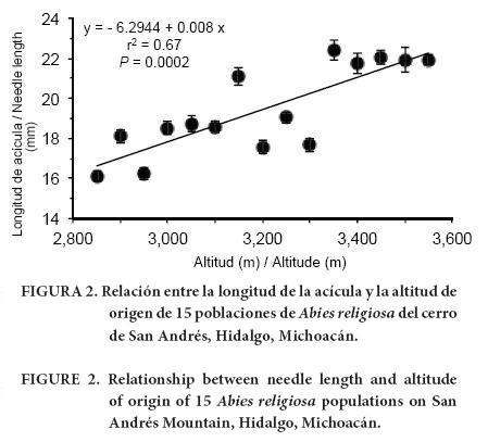 Las poblaciones de mayor altitud presentaron, en promedio, acículas más largas que las poblaciones de menor altitud (r2 = 0.67, P = 0.0002; Figura 2). Esto es un resultado inusual; comúnmente, las hojas son más cortas a mayor altitud debido probablemente a que las temperaturas bajas inducen crecimiento menor de las acículas (Sáenz-Romero et al., 2012a; Viveros-Viveros et al., 2013). El patrón opuesto de A. religiosa pudiera deberse a que la densidad elevada de los rodales en la parte media de la distribución altitudinal y la gran nubosidad en los sitios más altos causan mayor condición de sombra, lo cual induce la elongación de las acículas como mecanismo de respuesta a la falta de luz. Sin embargo, esto es una explicación hipotética que requeriría de estudios con enfoque ecofisiológico.