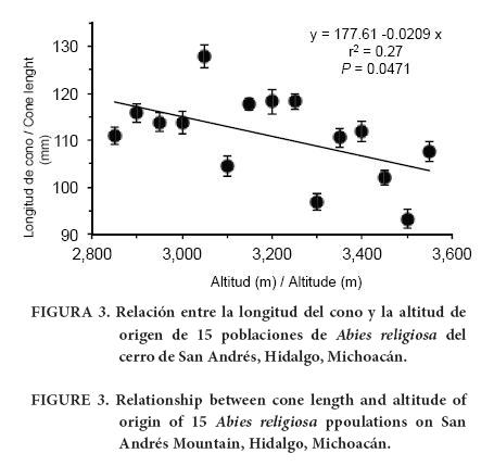 Por otra parte, las poblaciones de mayor altitud mostraron conos más cortos que las poblaciones de menor altitud (r2 = 0.27, P = 0.0471; Figura 3). Este último patrón es lo esperado, ya que usualmente los conos son más grandes a menor altitud (Sáenz-Romero et al., 2012a). El ancho de cono no presentó ningún patrón significativo de variación en relación con el gradiente altitudinal.