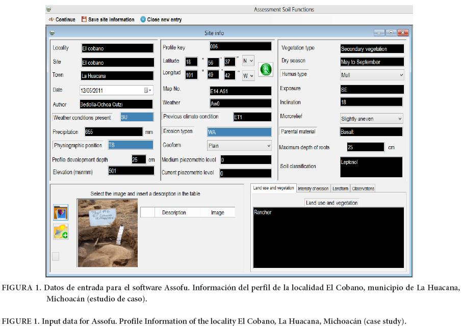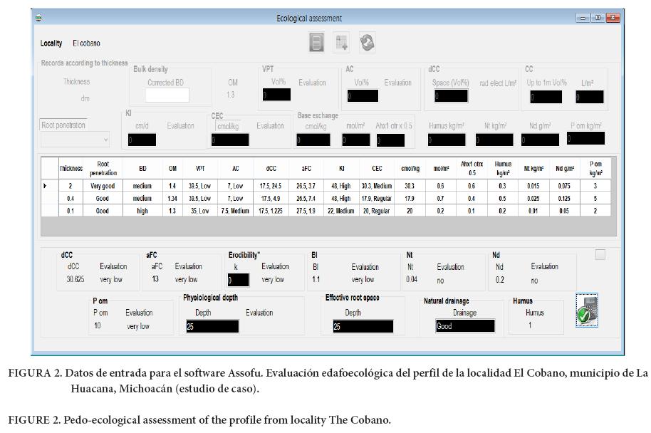 Los datos de entrada para el software Assofu son: a) información del sitio, b) propiedades de los horizontes del perfil y c) propiedades para la evaluación edafo-ecológica. Esta información es necesaria para la aplicación de las evaluaciones. En la Figura 1 se muestra la información del perfil 'El Cobano' que fue capturada utilizando datos medidos e introducidos directamente en las cajas de texto (identificadas con fondo negro) y datos estimados en los que el usuario utilizó formularios de referencias para la estimación de propiedades (identificados con fondo azul).