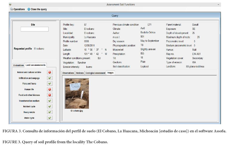 La información de entrada para la evaluación de las funciones del suelo, en el software Assofu, es extraída de la base de datos de perfiles de suelo de manera automatizada, con lo cual disminuye la posibilidad de introducir errores durante la ejecución. A continuación se presentan dos evaluaciones para el perfil de suelo de la localidad El Cobano.