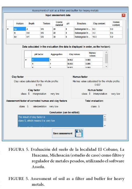 La Figura 5 muestra la evaluación del suelo como filtro y regulador de metales pesados. El factor pH y el factor de agregación fueron estimados en clase 1 (muy alto) con base en tablas. Dichas estimaciones son utilizadas para calcular el valor de arcilla y de humus para el perfil completo del suelo considerando también el espesor del horizonte y el volumen de fragmentos gruesos. La clase del resultado final se obtiene a partir de tablas con escalas del valor de las propiedades estimadas. Tanto la arcilla como el humus corresponden a la clase 5, por lo que sus valores para este perfil de suelo son muy bajos.