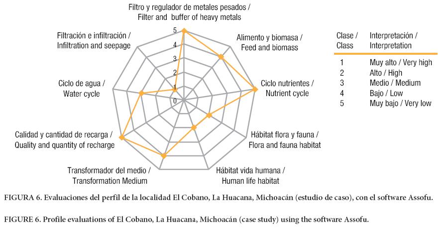 Los modelos de evaluación de las funciones del suelo implementados en Assofu son: a) hábitat para la vida humana, b) hábitat de la flora y la fauna, c) componente del ciclo del agua, d) transformación del medio, e) ciclo de nutrimentos, f) archivo natural, g) producción de alimentos y biomasa, h) filtro y regulador de metales (Lehmann et al., 2008), i) almacenaje de carbono orgánico (Penman et al., 2003; Pérez-Ramírez, Ramírez, Jaramillo, & Bautista, 2013) y j) suelo como reactor (retención y mineralización) de aguas residuales (Aguilar, Bautista, & Díaz-Pereira, 2011). El resultado de las evaluaciones se clasifica utilizando tablas de referencia donde: clase 1 = nivel muy alto, clase 2 = nivel alto, clase 3 = nivel medio, clase 4 = nivel bajo y clase 5 = nivel muy bajo.