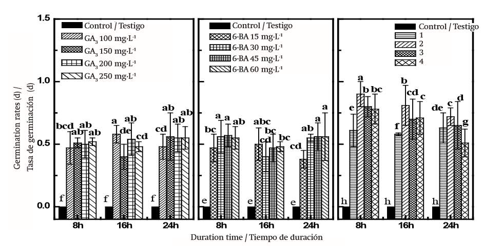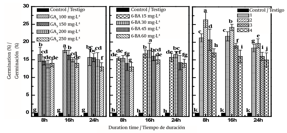 Prior to experimental treatment, the collected seeds were examined to remove those that were stained, discolored, and damaged. All seeds were bathed in water, and floating seeds were removed from the water surface. Seeds were sterilized by immersion in 75 % alcohol for 30 min and rinsed three times using distilled water. Then the seed coats were removed by breaking the shell without damaging the endosperm and embryo. The experiment was therefore conducted as follows: (1) The seeds were immersed in 100, 150, 200 and 250 mg·L-1 GA3 solution for 8, 16 and 24 h, (2) The seeds were soaked in 15, 30, 45 and 60 mg·L-1 6-BA solution for 8, 16 and 24 h, (3) The seeds were soaked for 8, 16 and 24 h using the following combinations: 100 mg·L-1 GA + 15 mg·L-1 6-BA, 150 mg·L-1 GA3 + 30 mg·L-1 6-BA, 200 mg·L-1 GA3 + 45 mg·L-1 6-BA, and 250 mg·L-1 GA3 + 60 mg·L 6-BA. Distilled water was used for the controls, three replications of 50 seeds were prepared for each treatment. After treatments, the seeds were placed in 9 cm-diameter Petri dishes with a filter paper moistened with 5 mL of distilled water at a day/ night temperature of 25/22 °C in a 12-h photoperiod supplied by fluorescent lights (70-110 µmol·m-2·s-1, 400-600 nm) and 50 % relative humidity. The Petri dishes were observed daily until the onset of germination. At the end of the experiment, the seeds were considered germinated if the radicle reached 1 mm in length. Germination was recorded daily until its cessation with a minimum of 10 d. Germination percentage (GP) and rates of germination (GR) were calculated according to the following formula (Olmez, Goktur, & Temel, 2007):