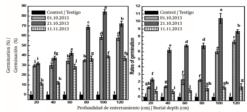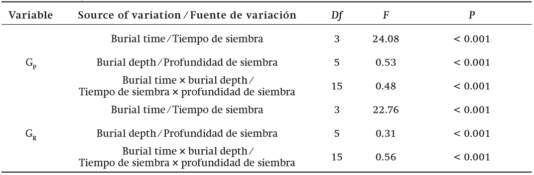 Table 2. ANOVA of the germination percentage (GP) and germination rate (GR) of Daphne giraldii seeds as result of varying depth and time of burial carried out in 2013 in an open field (split-plot ANOVA).