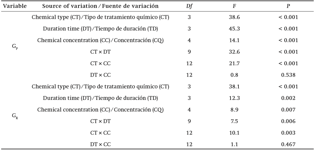 ANOVA and Duncan's multiple range tests were carried out to analyze the data (Duncan, 1955) and the pre- treatment effects on GP and GR were determiden using the SPSS 10.0 software package (Statistical Package for the Social Sciences [SPSS], 2000). GP data were arcsine transformed before analysis. Tukey multiple comparison test (LSD test) was performed to determine the treatments with significant differences (P = 0.05). GP and GR obtained in tests on chemical treatment were analyzed by means of a three-factorial ANOVA, whereas the data obtained from the other treatment were analyzed by means of a two-factorial ANOVA. The figures were created with Origin 8.0 (OriginLab Corporation, 2007) when ANOVA indicated significant treatment effects (P ≤ 0.05).