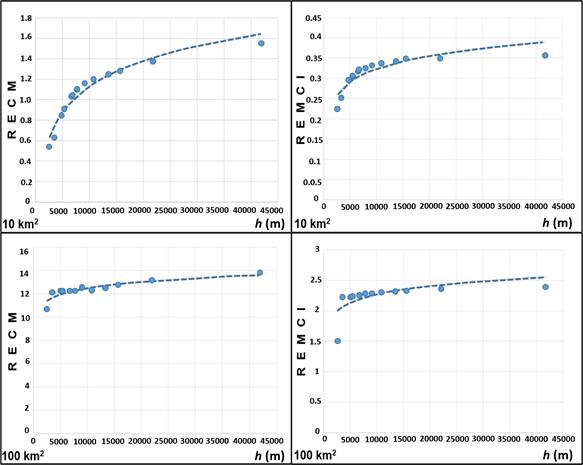 | 100 km2 | RECM | = 0.7927ln(h) + 5.1792 | 0.8135 |