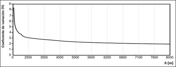 Los valores h obtenidos con las técnicas probadas se encontraron entre 2 550 y 41 906 m. Hubo gran variación en los resultados; el rango entre el valor máximo y el mínimo fue 39 356.34 m con una media de 10 936.74 ± 9 955.04 m. Lo anterior implica que no existe un proceso único y universal para todos los casos. De acuerdo con los criterios de validación, el valor de h estadísticamente más adecuado se encuentra entre 5 300 y 5 900 m; el resultado más cercano se obtuvo con la técnica distancia aleatoria media (5 395 m).