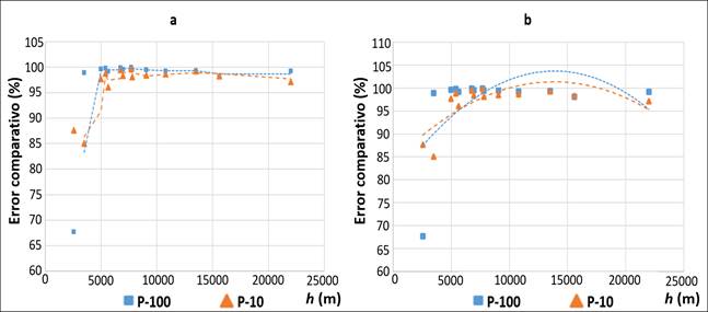 Con base en lo anterior, se encontró que la varianza (CV) disminuye al aumentar el valor de h, mientras que el sesgo (REMCI) aumenta; ocurre lo contrario al disminuir el valor de h. Por tanto, la definición del valor más adecuado de h será aquel que represente un compromiso entre varianza y sesgo (Álvarez & Yohai, 2012). Para ello, con base en el comportamiento asintótico de REMCI, se define una alternativa para determinar el valor de h, al ubicar el punto de quiebre o al menos un rango de quiebre donde se inicia la asíntota. Para esto, se determinaron los valores de porcentaje comparativo (PC), con base en el cual se define un rango de quiebre, alrededor de los 5 000 y 6 000 m (Figura 6a), situación que coincide para los dos tamaños de polígonos de comparación (10 y 100 km2). Para tratar de ubicar un punto de quiebre, se modelaron las tendencias del PC (P-10: y = -9E-08x2 + 0.0025x + 83.87, [R² = 0.5891]; P-100: y = -1E-07x2 + 0.0035x + 79.358, [R² = 0.5891]), cuyo cruce definió un punto de coincidencia alrededor de 5 600 m (h), lo cual se ubica dentro del rango de quiebre definido (Figura 6b). Finalmente, el valor de h estadísticamente más adecuado será aquel que más se aproxime a 5 600 m y que se ubique dentro del rango de 5 000 y 6 000 m. De acuerdo con esto, el proceso de definición de h que más se aproxima a este valor es el de distancia aleatoria media (h = 5 395 m).