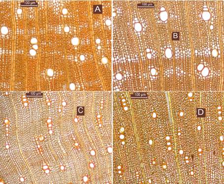 Figure 1 Size and density of secondary xylem vessels of the stem of two vigorous rootstocks (A: sour orange and B: 'Volkamer' lemon) and two dwarfing ones (C: 'Flying Dragon' trifoliate and D: 'Rubidoux' trifoliate) in 'Tahiti' lime grafts. Magnification 10x.