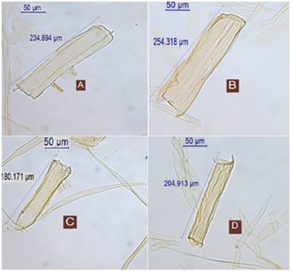 Figure 3 Average fiber length of the stem xylem of two vigorous rootstocks (A: sour orange and B: 'Volkamer' lemon) and two dwarfing ones (C: 'Flying Dragon' trifoliate and D: 'Rubidoux' trifoliate) in 'Tahiti' lime grafts. Magnification 10x.