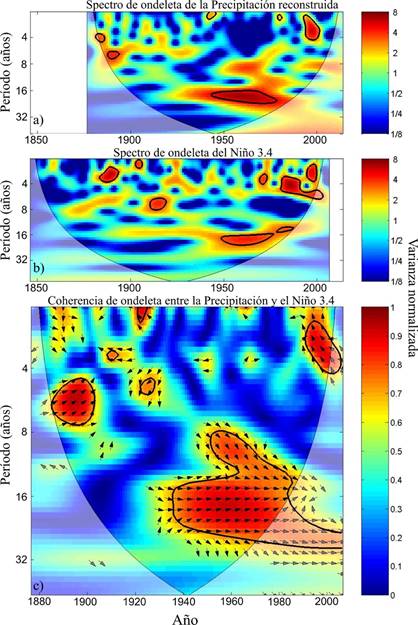 Figura 5 Espectros potenciales de ondeleta a nivel anual: a) precipitación reconstruida, b) índices Niño 3.4, y c) dominio de coherencia de ondeleta entre la serie de precipitación reconstruida y el índice Niño 3.4. Las áreas en color rojo delimitadas por una línea de color negro representan periodos con frecuencias significativas (P < 0.05) y las flechas orientadas hacia la derecha indican que ambos fenómenos están en fase (relación positiva).