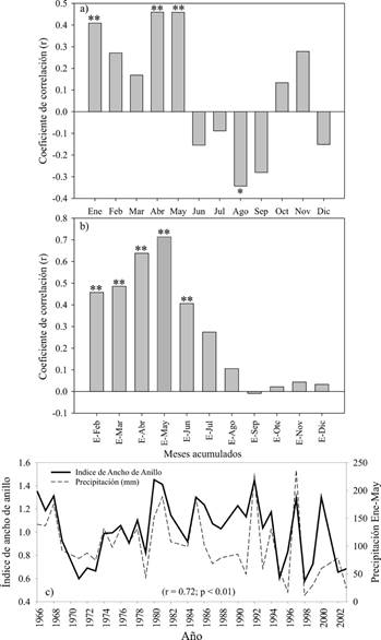 Figura 2 Función de respuesta climática en el suroeste de la Reserva de la Biosfera Sierra Gorda: a) correlación entre el índice de ancho de anillo total y los registros de precipitación promedio mensual en el periodo 1966 al 2003, b) correlación entre el índice de ancho de anillo total y los registros de precipitación acumulada en el periodo 1966 al 2003, y c) asociación entre el índice de anillo total y la precipitación estacional promedio observada enero-mayo (invierno-primavera) en el periodo 1966 al 2003. Significancia estadística: *P < 0.05 y **P < 0.01.