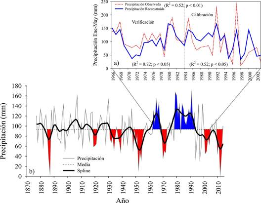 Figura 3 Precipitación reconstruida: a) calibración (subperiodo 1985-2003) y verificación (subperiodo 1966-1984) del modelo de regresión. b) Precipitación estacional invierno-primavera (enero-mayo) en 138 años para el suroeste de la Reserva de la Biosfera Sierra Gorda. La línea gris al fondo indica la variabilidad anual de la precipitación; la curva flexible en color negro es una línea suavizada en intervalos de 10 años (spline) para detectar eventos secos (precipitación por debajo de la media) o húmedos (precipitación por encima de la media); y la línea horizontal punteada indica la precipitación promedio (96 mm). Las áreas en color rojo muestran las sequías más fuertes y en color azul las precipitaciones mayores.