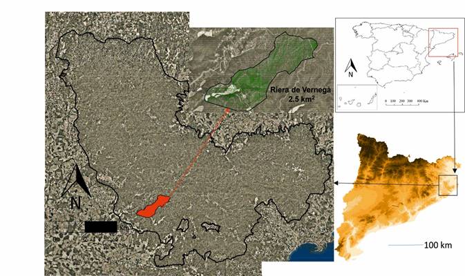 The study area is located in northeastern Spain in the province of Girona in the Les Gavarres Massif, where for more than 30 years studie have been conducted on hydrology and erosion in different land uses, both at slope and basin level. The experimental 2.5 km2 Vernegà stream basin is the study unit (Figure 1). The Vernegà stream is intermittent or seasonal due to the limited and highly variable rainfall and the granitic nature of the substrate that provides high permeability, having a granitic aquifer inside. The climate is subhumid Mediterranean with average annual rainfall of around 650 mm. Most precipitation occurs during autumn and spring. The depth of the Luvisol-classified soil (IUSS Working Group WRB, 2006) is 1 m, with a structure composed of 80 % sand, 18 % silt and 2 % clay. The vegetation is composed of Q. suber and Quercus ilex L. and in some areas Pinus pinaster Aiton., P. pinea L.and P. halepensis, as well as a significant understory of Erica arborea spp. and Arbutus unedo L. as main shrubs. The density of forest roads in the basin is 2.1 km·km-2.
