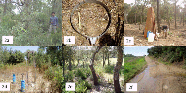 Seven research units were selected: dense forest, recently managed Q. suber forest, Q. suber forest managed two years ago, recently managed P. halepensis forest, P. halepensis forest managed two years ago, a bare area with sparse vegetation and a forest road (Figure 2). In each area, four rainfall simulations were carried out in June 2014; in total, 28 one-hour simulations were carried out. The four simulations, in each of the areas, were carried out in a 0.5 ha area.
