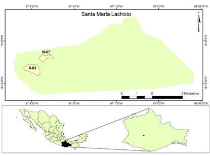 The study area is located in the municipality of Santa María Lachixío in the state of Oaxaca, Mexico (Figure 1). Sampling was done in two stands dominated by the species Pinus douglasiana Martínez, P. herrerae Martínez, P. lawsonii Roezl ex Gordon, P. leiophylla Schiede ex Schltdl. & Cham., P. oocarpa Schiede ex Schltdl, P. pringlei Shaw, and P. pseudostrobus Lindl. The stands were identified in the management program as II-03 with an area of 43.07 ha and as III-07 with 20.3 ha. The commercial use of the stands was carried out in 2003 with cutting intensities of 27.8 and 33.1 %, respectively. For the purposes of this study, 15 randomly-selected sampling points were established in each stand, considering an internal area of 20 m from the periphery to override the border effect. At each point, the nearest stump was located that presented the authorization mark for timber harvesting in a visible manner and from which there was at least one living individual within a 10-m radius.