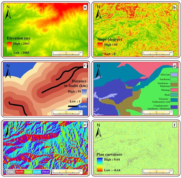 Elevation is one of the most commonly used factors in landslide susceptibility studies (Buğday, 2018; Meng et al., 2016). The average height in the study area is 1 410 m, minimum height is 1 100 m, and maximum height is 2 050 m. In this study, the elevation factor has been classified in five classes (1 000 m to 2 250 m; Figure 2a). Slope (degree) is one of the most frequently used factors in landslide susceptibility studies (Behling, Roessner, Kaufmann, & Kleinschmit, 2014; Eskandari, Homaee, & Falamaki, 2016; Niu et al., 2018). The average slope in the study area is 14.33°, whereas the minimum is 3.25°, and maximum is 54.83°. In this study, the slope was classified into five different groups: 0-4.99°, 5-11.99°, 12-17.99°, 18-21.99° and 22-65.8° (Figure 2b). Distance to faults is an important factor increasing the landslide formation and the size of landslides considerably (Feizizadeh, Blaschke, & Nazmfar, 2014; Meng et al., 2016). Distance to faults was classified into six different groups: 0-0.99 km, 1-1.99 km, 2-2.99 km, 3-3.99 km, 4-4.99 km, and 5-10 km (Figure 2c). Lithology is a factor commonly included in landslide susceptibility studies (Pourghasemi & Kerle, 2016). Lithology map was derived from the 1:100 000 scale geological map (Duman, Çan, & Emre, 2011) obtained from the General Directorate of Mineral Research and Exploration (MTA). There are six different lithological groups in the study area: clastic and carbonate rocks (k2: Cretaceous), terrestrial clastic rocks (pl: Pliocene), evaporative sedimentary rocks (olm1: Oligocene-Miocene), clastic rocks (e1-2: Eocene), basic and ultrabasic rocks (of: Mesozoic) and Quaternary (Q) formations (Figure 2d). The study area is one of the areas where landslides occur frequently within the provincial boundaries. It is highly prone to landslides due to the Cretaceous age and sandstone content (Sahin et al., 2018). The aspect factor is one of the factors included in this type of study (Niu et al., 2018; Yalcin, Reis, Aydinoglu, & Yomralioglu, 2011), and it was classified into five different groups (plain, north, east, south and west) in this study (Figure 2e). The dominant aspect of the study area is the south. Plan curvature factor is one of the factors frequently referred to in order to establish the direction of slope in landslide studies (Oliveira, Zêzere, Guillard-Gonçalves, Garcia, & Pereira, 2017; Pourghasemi & Kerle, 2016). Plan curvature was divided into five groups for this study: -0.098, -0.023, 0.013, 0.093, and 0.639 (Figure 2f).