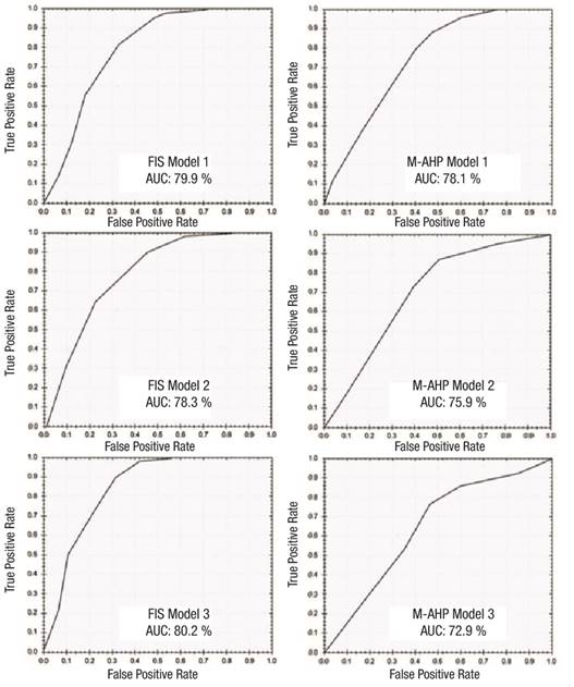 Figure 5 Models’ validations (receiver operating characteristic curve and area under curve [AUC] values) using fuzzy inference system (FIS) and modified analytical hierarchy process (M-AHP) approaches.