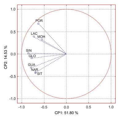 According to the Principal Component Analysis shown in Figure 3, the first component accounts for 51.8 % of the common variance, with an eigenvalue of 4.5, while components 2 and 3 contributed 14.5 % and 10.2 % of the variance, respectively, representing 76.5 % of the cumulative total variance. The MOH and POR series showed different behavior to the rest of the chronologies; therefore, in order to integrate the regional chronology, they were excluded from this analysis. The LAC series was not ruled out because it presented high correlation together with the other series, which translates into the same variability.