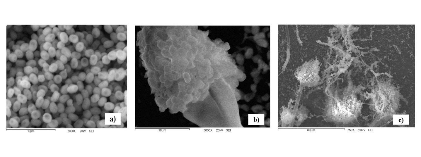 Figure 1 Microscopic features of Aspergillus terreus by scanning electron microscopy (JEOL JSM-5410 LV): a) spores, bar indicates 10 µm; b) conidiophore, bar indicates 10 µm; c) hyphae, conidiophore and spores, bar indicates 80 µm.