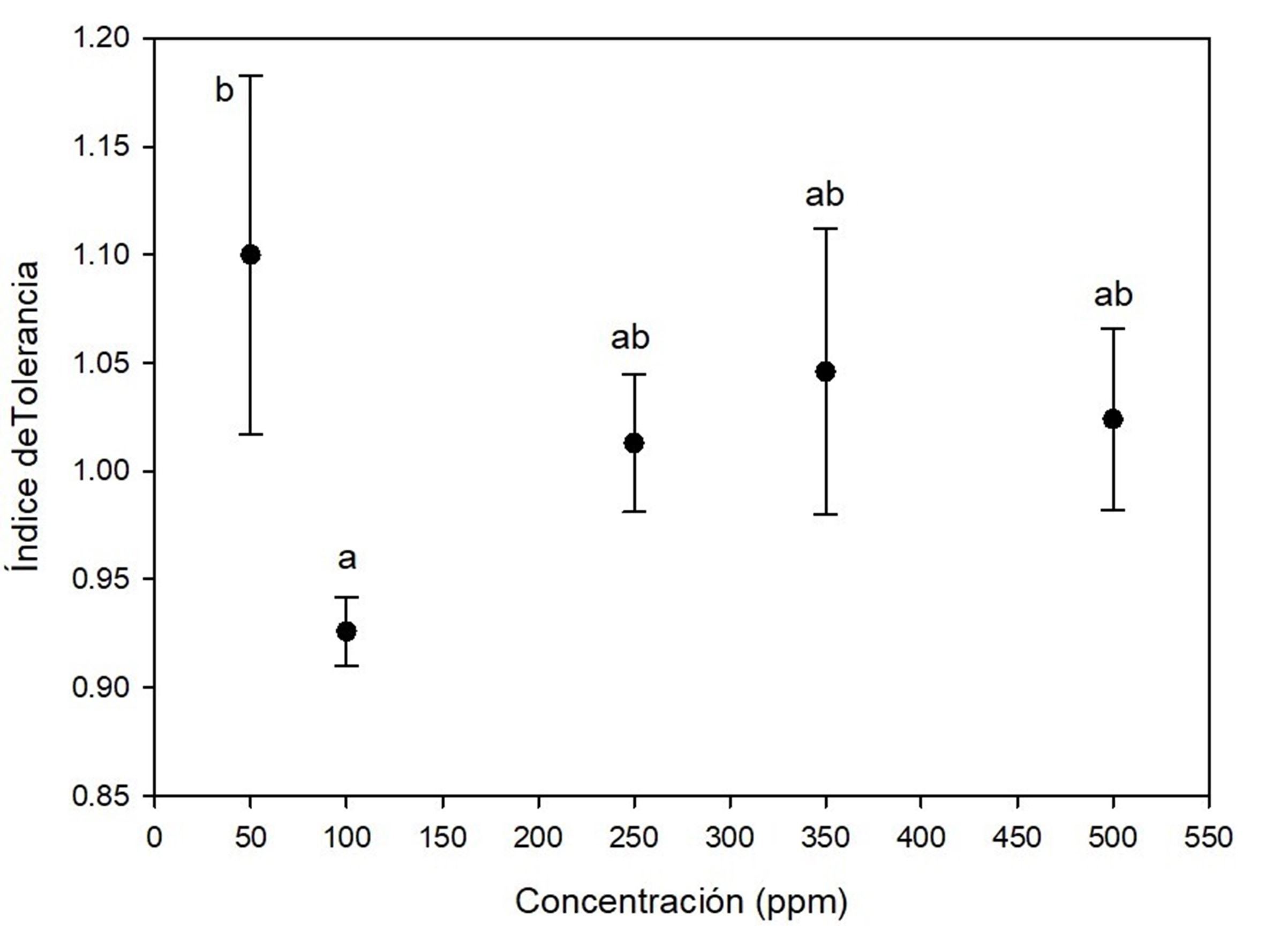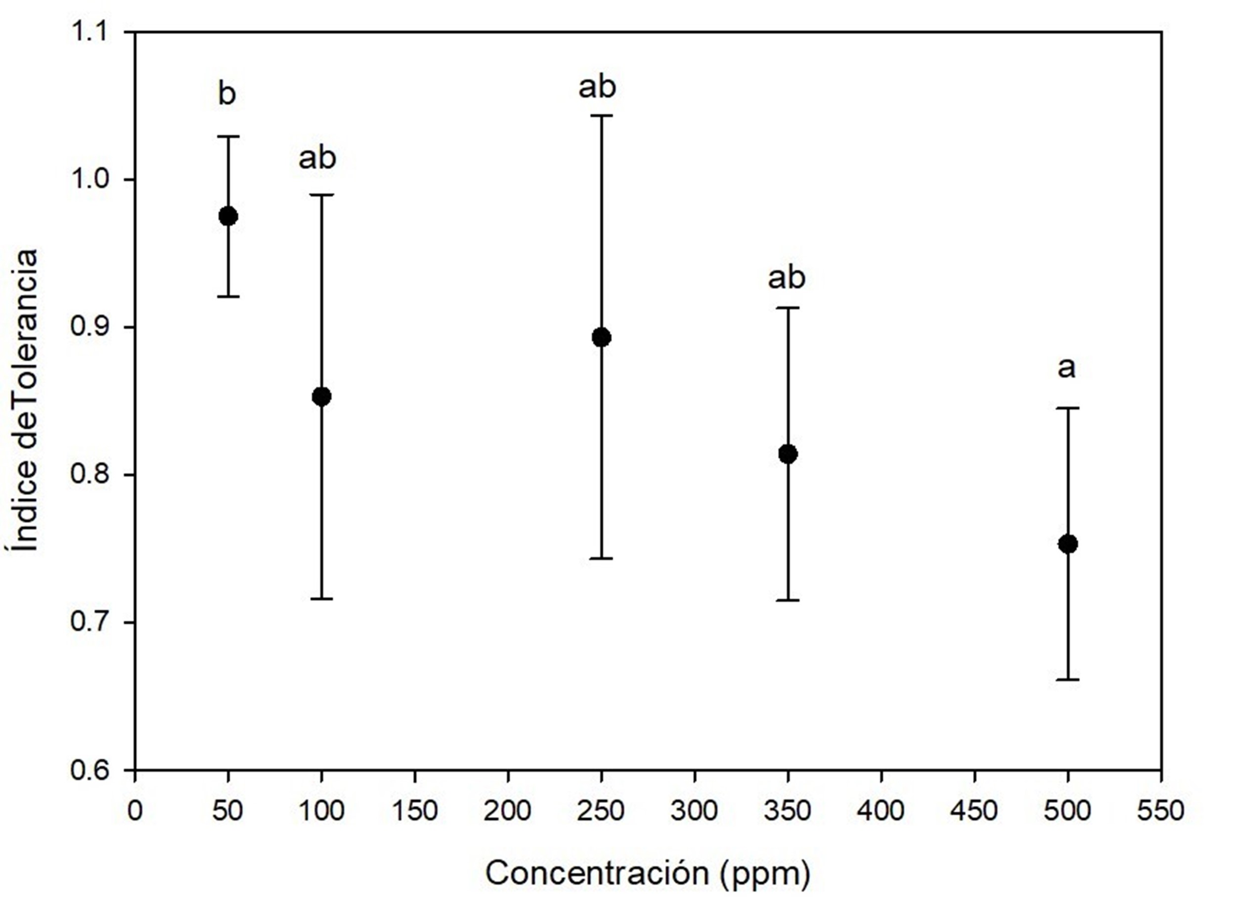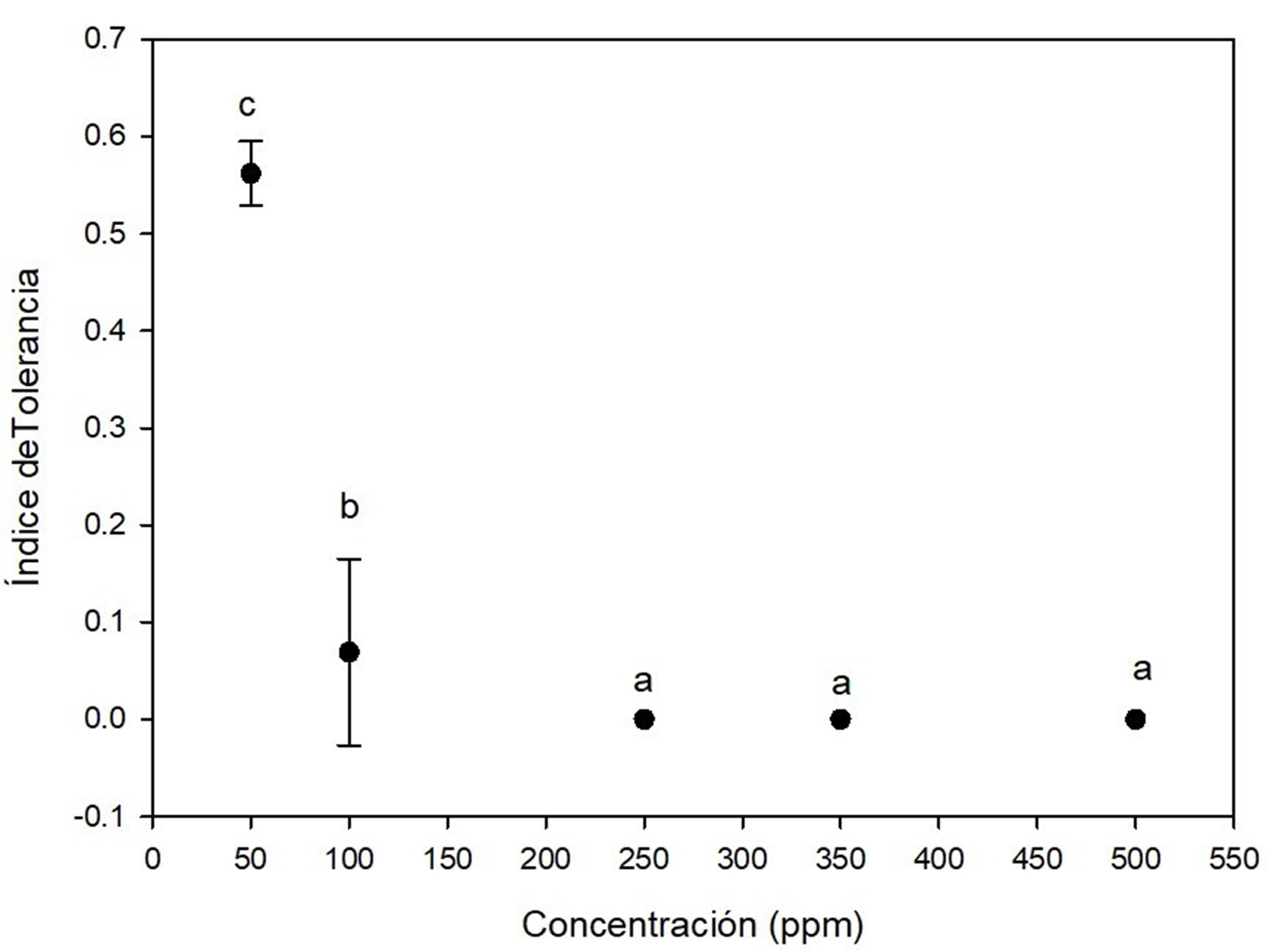 Figure 2 Tolerance index of Aspergillus terreus at five concentrations of (CH3COO)2 Pb(3H2O as a source of lead. Different letters indicate significant differences in tolerance index between concentrations according to the Tukey's test (P < 0.05). The bar shows the standard deviation of the mean.