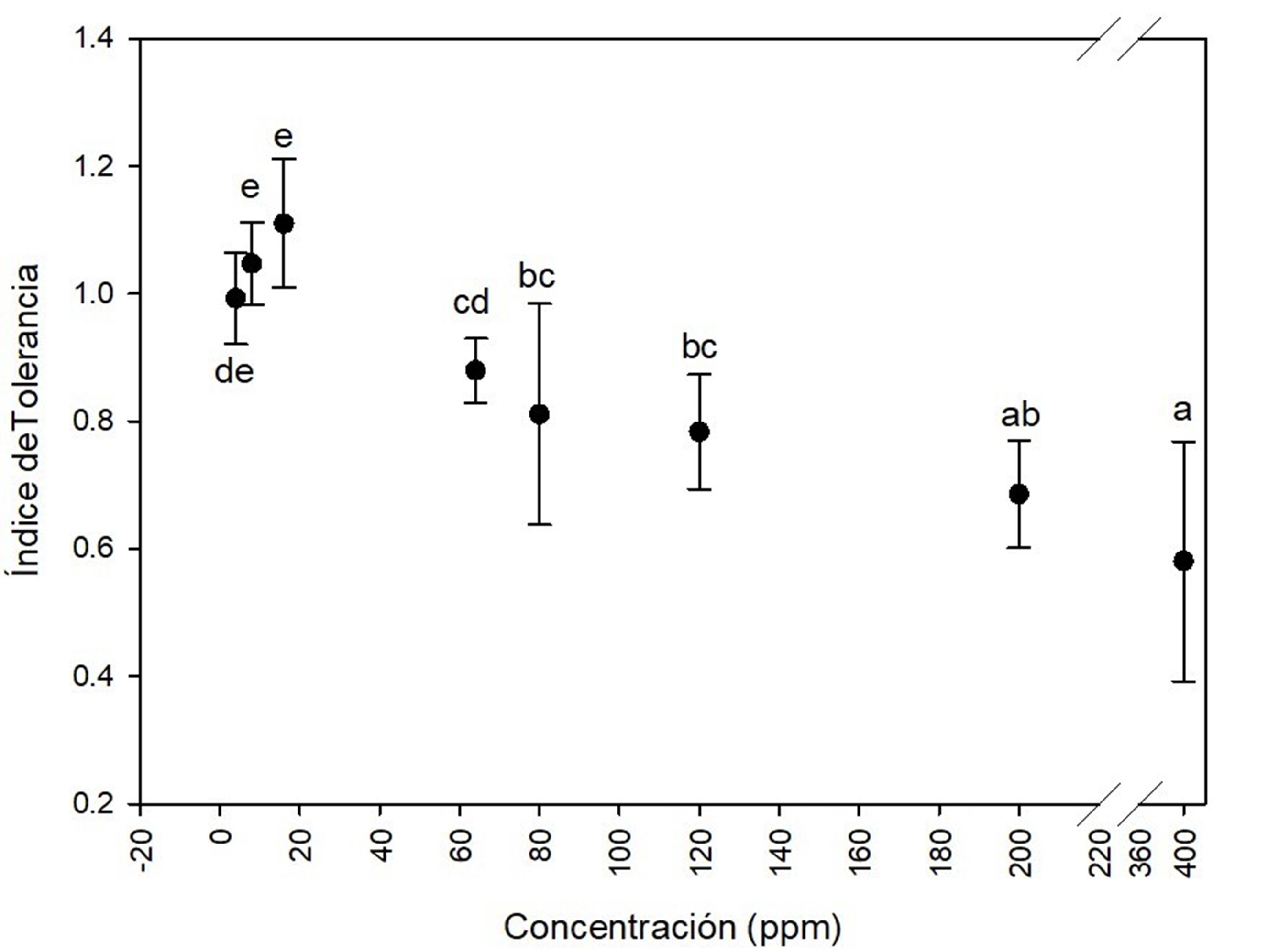 Figure 5 Tolerance index of Aspergillus terreus at several concentrations of (4, 8, 16, 64, 80, 120, 200 and 400 ppm) of the mixture of cadmium (CdCl2), chrome (K2Cr2O7), mercury (HgCl2) and lead [(CH3COO)2Pb(3H2O] in equal proportion of each metal. Different letters indicate significant differences in tolerance index between concentrations according to the Tukey's test (P < 0.05). The bar shows the standard deviation of the mean.