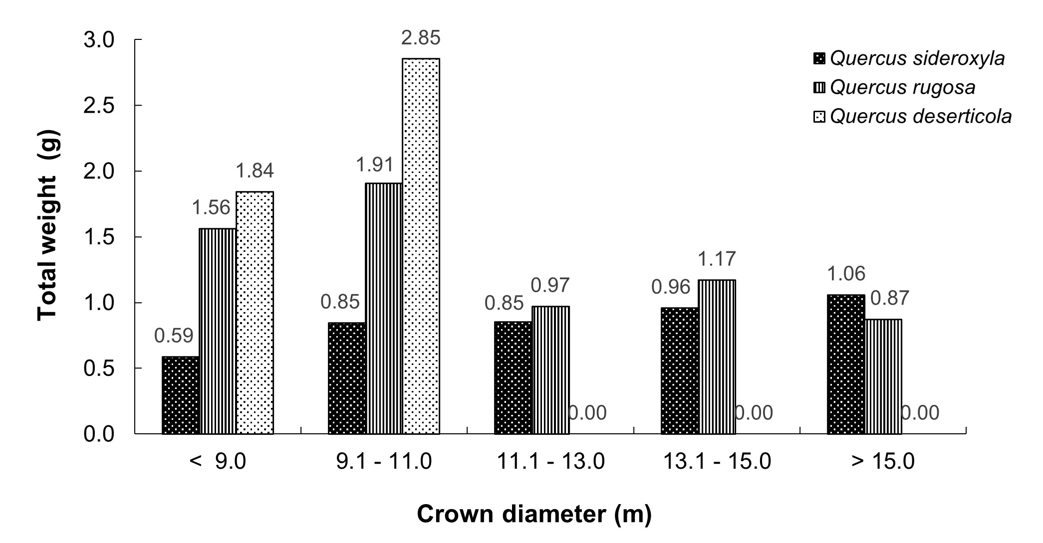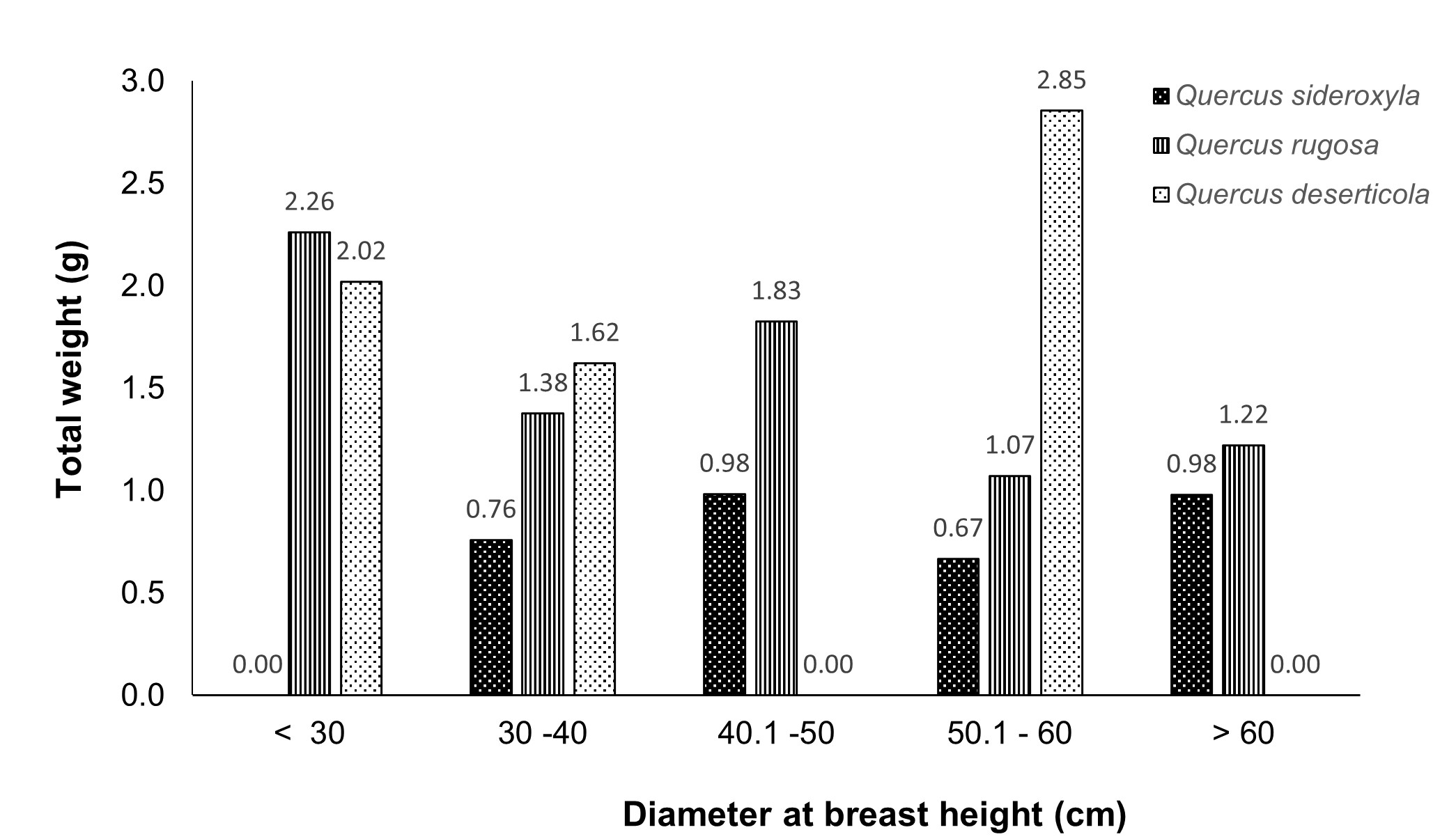 Figure 3 Distribution of weights among categories diameter at breast height of the three Quercus species studied.
